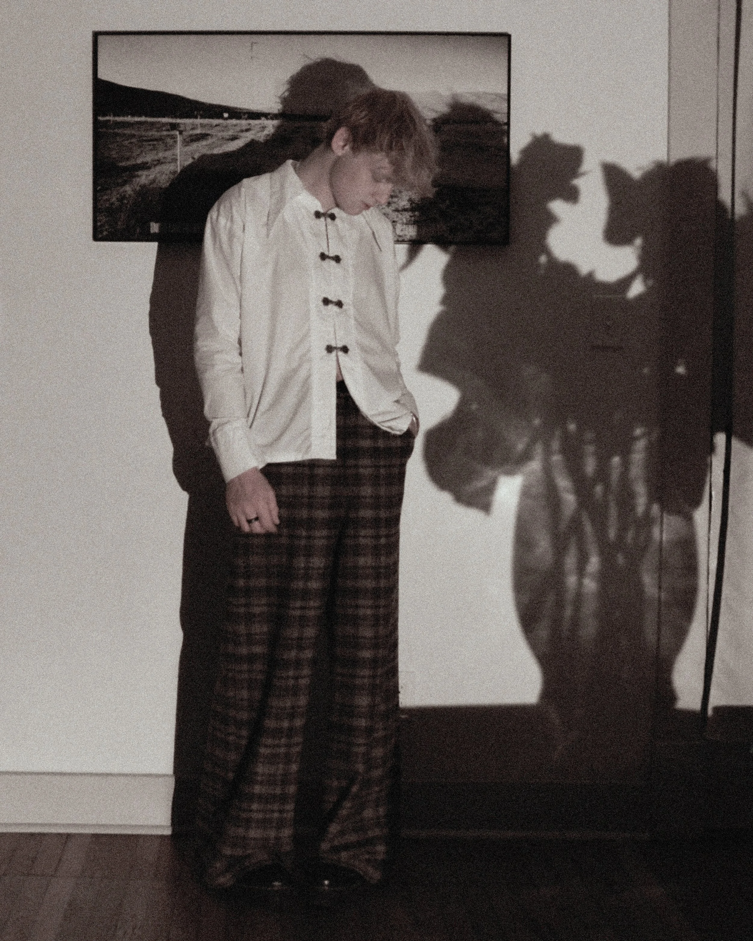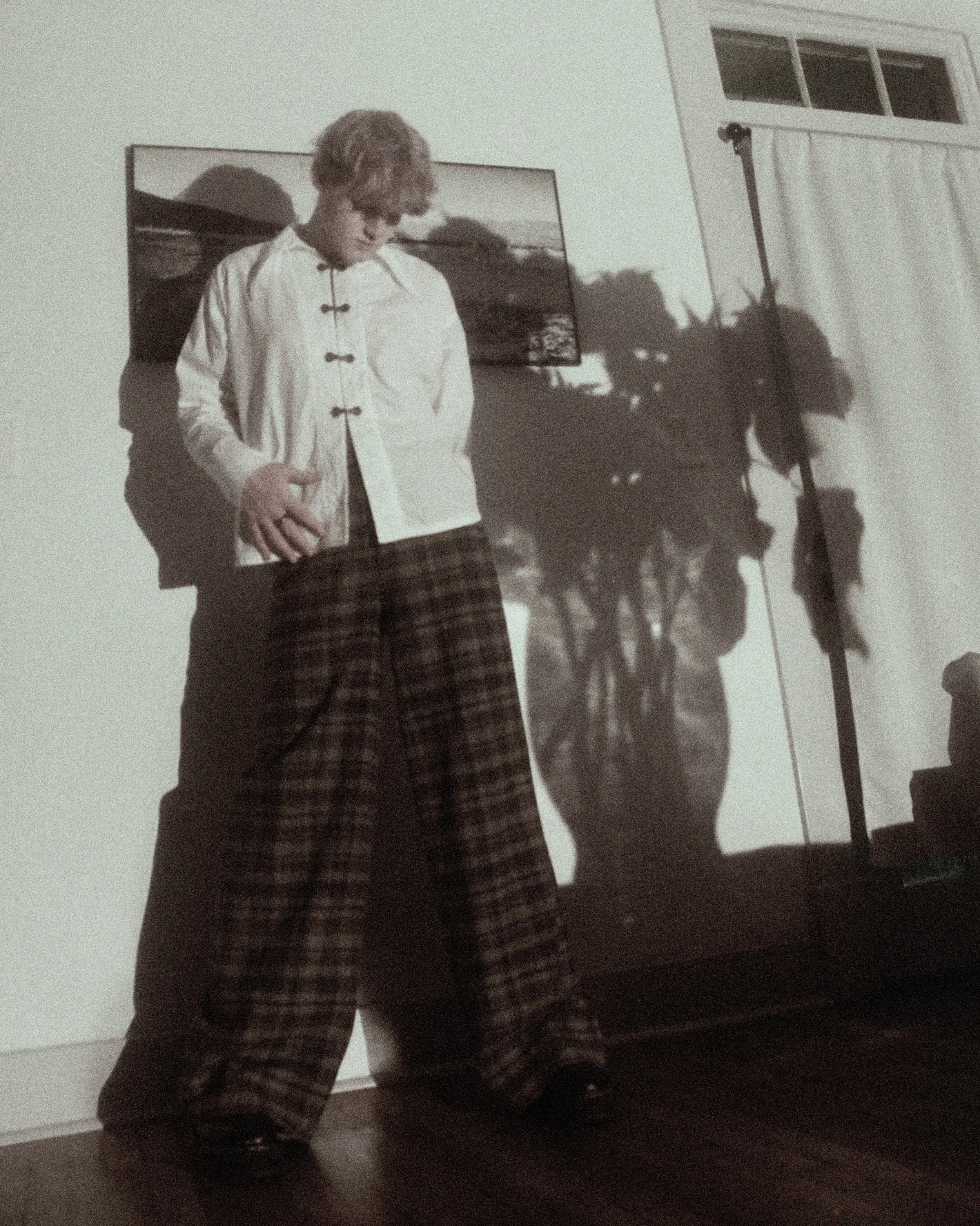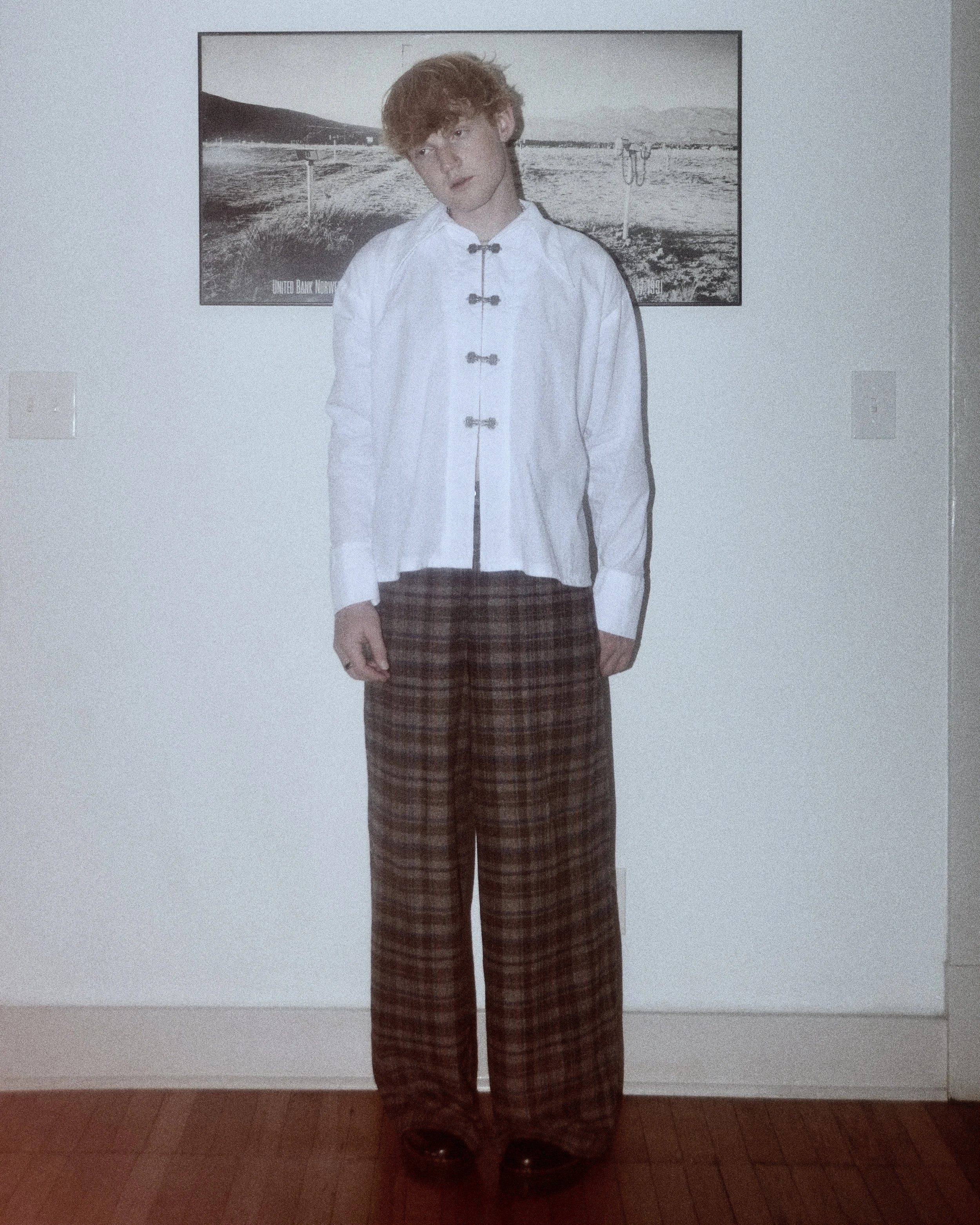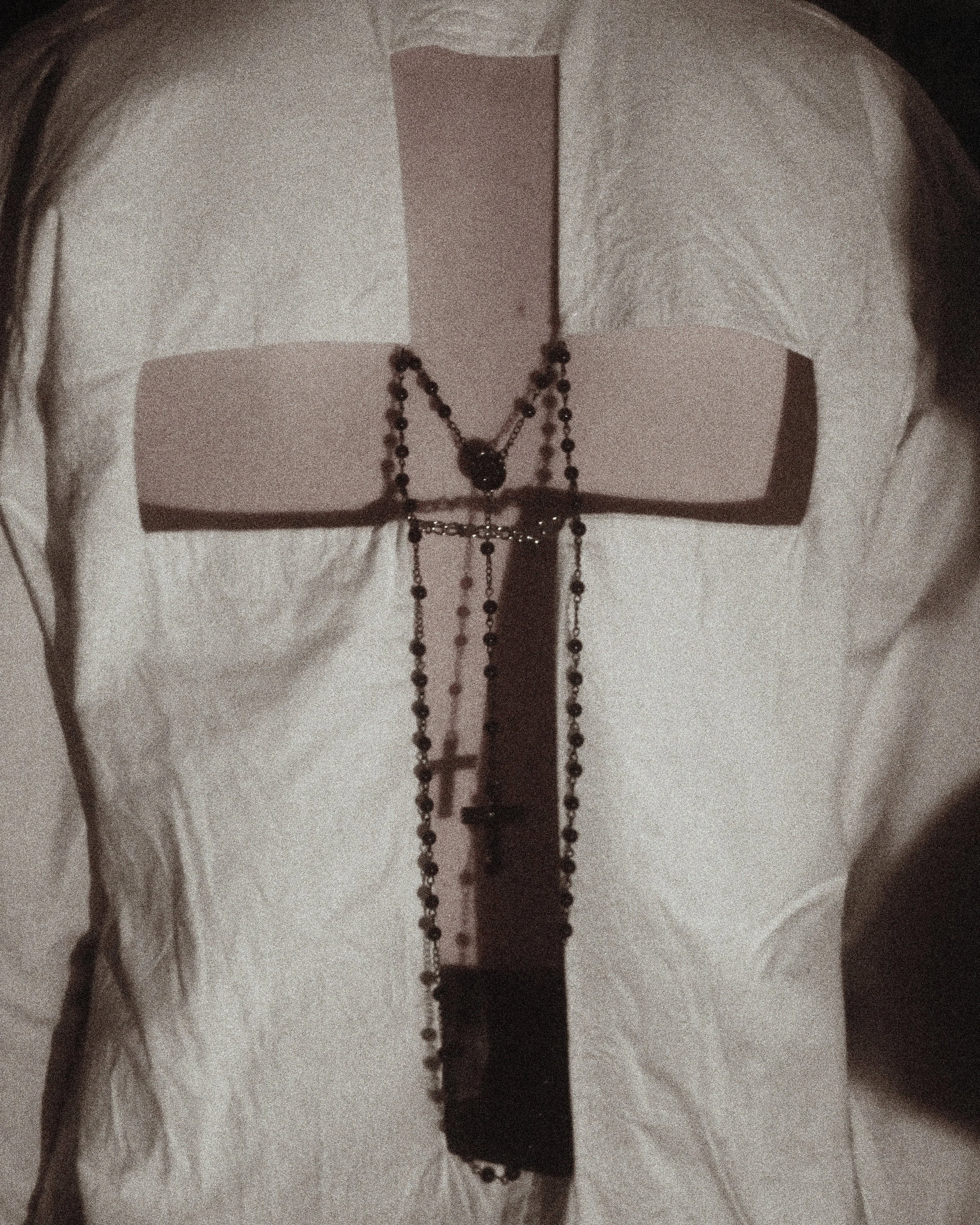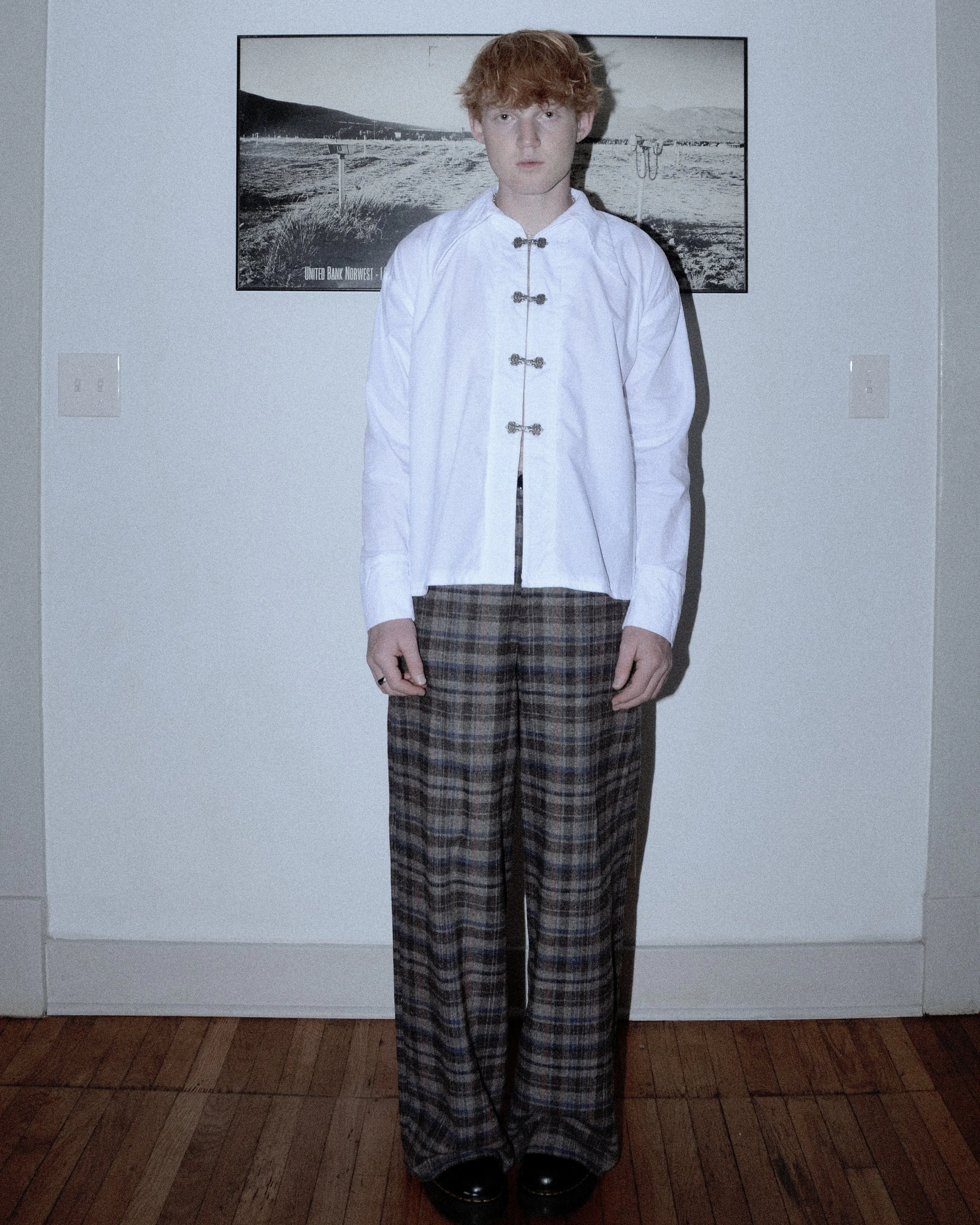 Bespoke Organic Cotton Lawn Button up featuring a cross cutout in the back and an extended collar.